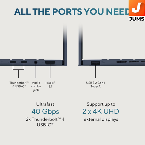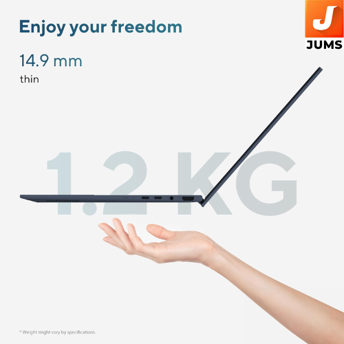 Model: ASUS Zenbook 14 OLED (14″, Ponder Blue) Processor: Intel Core Ultra 5 Series 2 (latest hybrid architecture with AI Boost NPU) ASUS Store Memory: 16 GB LPDDR5X RAM (onboard, dual-channel) ASUS Store Storage: 1 TB M.2 NVMe PCIe 4.0 SSD ASUS Store Display: 14.0″ 3K (2880×1800) OLED touchscreen with 16:10 aspect ratio, 120 Hz refresh, high brightness and wide color gamut — excellent for visuals, media and productivity. ASUS Store Graphics: Integrated Intel Arc Graphics for smooth visuals and light creative workloads. ASUS Store Operating System: Windows 11 Home Software: Includes Microsoft Office Home 2024 + Microsoft 365 Basic (1-year cloud storage) ASUS Store Ports: Typically Thunderbolt 4 USB-C, USB-A, HDMI 2.1, audio jack — versatile connectivity for displays and peripherals Battery & Mobility: Lightweight (~1.2–1.3 kg) with long battery life and fast USB-C charging — great for on-the-go productivity