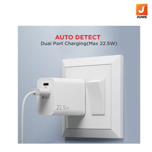 The boAt WCDV 22.5W QCPD Dual Port Wall Charger with 18W Quick Charge 3.0 and 22.5W Power Delivery support is the answer to all your charging needs. Its smart IC protection offers built-in surge protection, short circuit protection, over current protection & overheat protection. With universal compatibility, it will connect to all Micro-USB, Type C and Power Delivery cables. Its built-in auto-detect charging (Max 22.5W) adapts to your device’s charging needs automatically. The durable capacitors have up to 10000 cycles and is aptly complimented by its corrosion resistant pins.