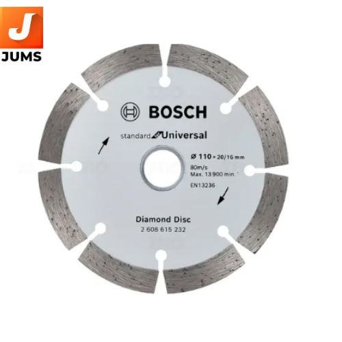 Bosch 110 mm Expert for universal diamond cutting disc provides long life in universal building materials. Laser-welded diamond cutting segments (12-mm height) provide robustness when cutting. Optimised diamond matrix provides long life. With 20/16 mm bore for angle grinders. Materials Compatible for Cutting: Concrete, Reinforced Concrete, Lime and Sand Bricks, Solid Bricks and Hard Stone.