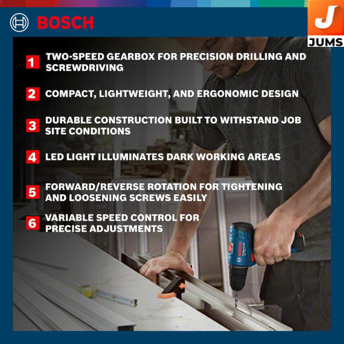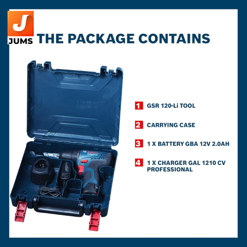 Brand Bosch ISIN ERHLJIKCOG Offer ID 1000158412 Brand Model Number GSB 120 Li Kit Size 10 mm Brand Colour Blue Voltage 12 V Battery Amp Hours 2.0 Ah Battery Type Lithium Ion Chuck Capacity, Min./Max 10 mm Material Plastic & Metal Item Weight 900 g Lock On Switch No Maximum Speed (RPM) 1500 rpm Motor Type Brushed Power Type Cordless Power Source AC Reversible No Drilling Diameter In Masonry 8 mm Drilling Diameter In Metal 10 mm Drilling Diameter In Wood 20 mm Usage Multipurpose Package Contents 1 pc Cordless Impact Drill 10 mm Pack Of 1 Warranty 12 months Country of Origin Malaysia Customer Care Address 1800-425-8665 (Toll free) Imported By Bosch Ltd., Post Box No: 3000,Hosur Road, Adugodi, Bangalore - 560030, India, Customer care No - 18004258665