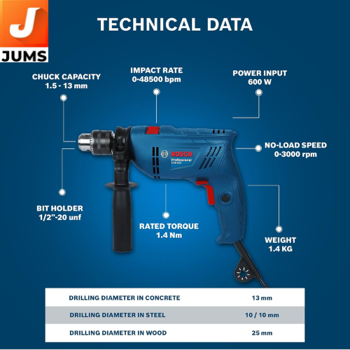 600 W Powerful Motor — Provides strong and consistent performance for drilling and fastening tasks in wood, metal, and masonry. High Speed (Up to 3000 RPM) — Ensures effective drilling efficiency and faster work completion. Rated Torque of 1.4 Nm — Offers adequate torque for a wide range of drilling and screw‑driving applications. Impact Rate ~48,000 BPM — Delivers rapid hammering action for easier drilling in concrete and brick.Impact & Drill Modes — Suitable for both regular drilling and hammer drilling on hard surfaces. Forward/Reverse Rotation — Makes screw driving and removal easy and efficient. Double Insulation — Enhanced safety design that prevents electrical shocks (no earth/ground wire needed).