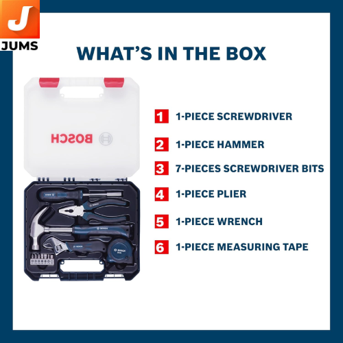 The BOSCH Hand Tool Kit (12-Pieces) is a reliable and professional-grade set designed for precision, durability, and everyday convenience. Crafted with high-quality, rust-resistant materials, each tool ensures long-lasting performance and strength for both home and professional use. The ergonomic design provides a comfortable grip for better control and reduced fatigue during extended tasks. Finished in Bosch’s signature blue and neatly organized in a sturdy hard case, this kit offers secure storage and easy portability—making it an ideal choice for repairs, maintenance, and DIY projects.