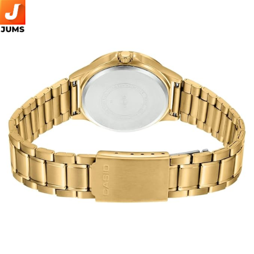This women’s Casio Enticer analog watch features a gold‑tone round dial paired with a stainless steel strap, combining timeless elegance with everyday practicality. It runs on a quartz movement for accurate timekeeping and uses mineral glass to protect the dial from scratches. The sleek design, compact case size, and comfortable bracelet make it suitable for both casual and formal wear.