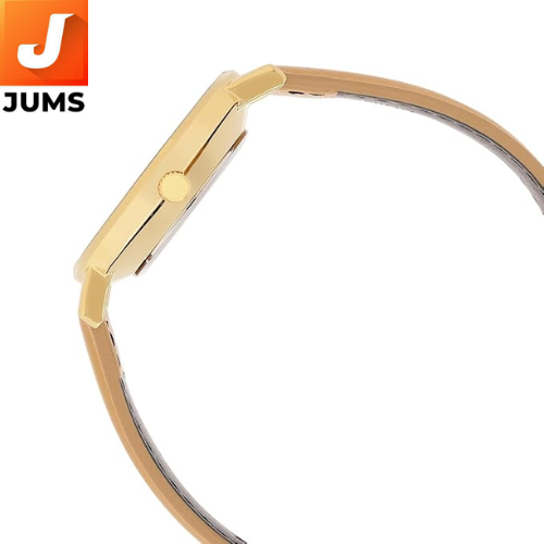 Quartz movement — delivers accurate and reliable timekeeping with minimal maintenance. Analog display with three hands (hour, minute, second) for easy and classic time reading.Gold‑tone round dial (sometimes appearing as beige/golden) — elegant and versatile for both casual and formal wear. Concave dial design that gently hugs the wrist for a streamlined, minimalist look. Mineral glass protects the dial from everyday scratches and wear.Case material: Gold‑ion‑plated stainless steel for durability and polished appeal. Strap: Brown genuine leather strap with a tang/buckle clasp for a secure, comfortable fit. Case size: Approx. 40 × 34 × 7.9 mm — compact and suited for women’s wrists.