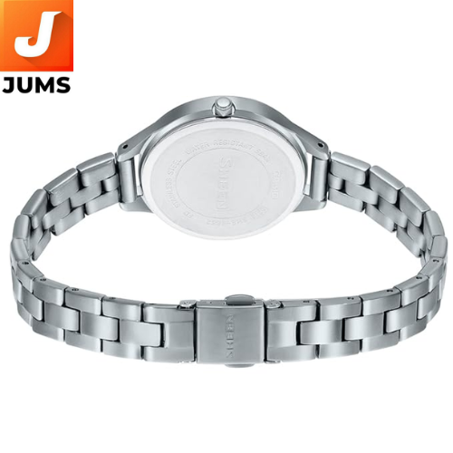 Quartz movement — reliable and accurate timekeeping with minimal maintenance. Analog display with traditional three hands (hour, minute, second) for clear time reading.Black round dial — elegant and versatile for both casual and formal styles. Cut mineral glass with a multifaceted finish that adds subtle sparkle and depth to the face. Date display at the 3 o’clock position for everyday practicality.Case material: Stainless steel — sturdy and refined. Strap: Stainless‑steel bracelet with a fold‑over clasp with double push‑buttons for a secure, comfortable fit. Mineral glass protects the dial from daily wear and minor scratches.