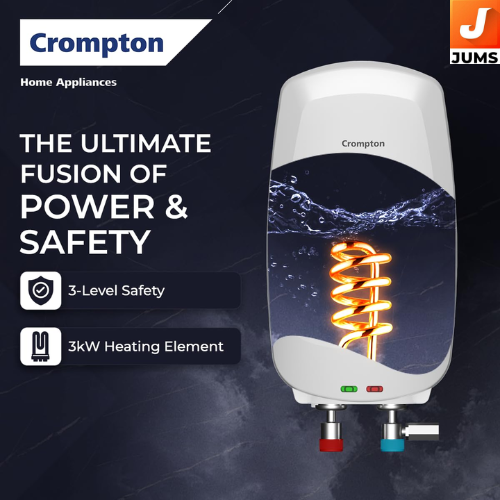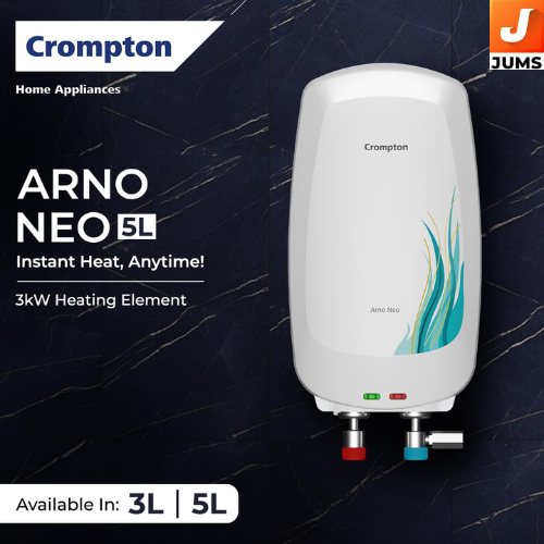 The Crompton Arno Neo 5 L Instant Water Heater is a high-performance electric geyser designed to deliver hot water instantly without the wait associated with storage tanks. With a 5 litre capacity, it provides ample hot water for daily household needs, including showers, bucket baths, and kitchen use — making it a versatile choice for small families or moderate daily usage.