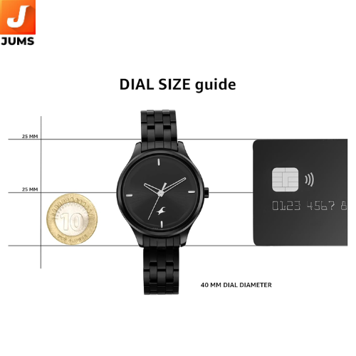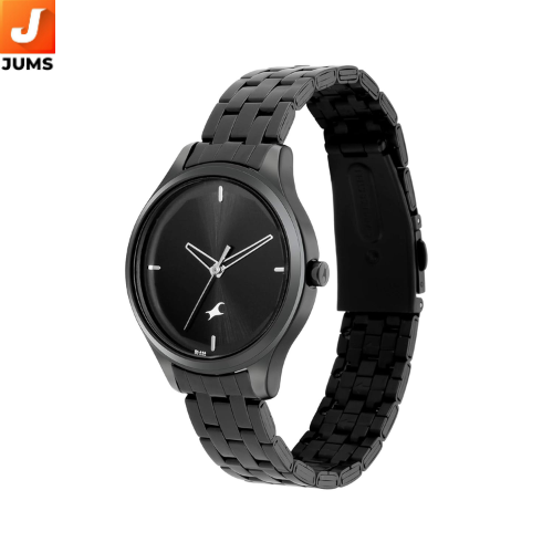 Brand: Fastrack Model: Stunners Type: Quartz Analog Watch Gender: Girls (sleek and fashionable design) Dial: Black with minimalist design and easy-to-read hour markers Strap: Black stainless steel strap, modern and durable Movement: Quartz for precise timekeeping Water Resistance: 30 meters (splash-resistant) Case Material: Stainless steel, lightweight and durable Dial Size: Medium-sized dial for a comfortable fit Design: Bold, trendy, and versatile Versatility: Perfect for casual, everyday wear and semi-formal occasions