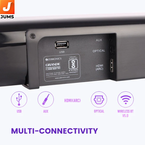 Product Name: Zeb Juke Bar 701 Grande Type: Soundbar with subwoofer Audio Quality: Clear sound with deep bass and enhanced treble for immersive audio Connectivity: Bluetooth 5.0, HDMI (ARC), AUX, USB, and Optical input Power Output: 120W RMS, delivering high-volume sound with clarity Subwoofer: Wired subwoofer for deep and punchy bass Design: Sleek, modern, and slim design with a premium finish Remote Control: Includes a remote for easy control of various functions Compatibility: Works with TVs, smartphones, laptops, gaming consoles, and more Additional Features: Equalizer presets, movie/music modes, and volume control options Price Range: Affordable, offering good value for its audio performance