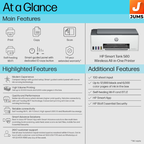 The HP Smart Tank 580 All‑in‑One Wi‑Fi Colour Printer is a high‑volume, cost‑efficient all‑in‑one ink‑tank printer designed for home, students, and small‑office use. It combines print, scan, and copy functionality with modern wireless connectivity, easy mobile printing, and an ink refill system that’s economical and mess‑free — perfect for everyday document and photo tasks while keeping running costs low.