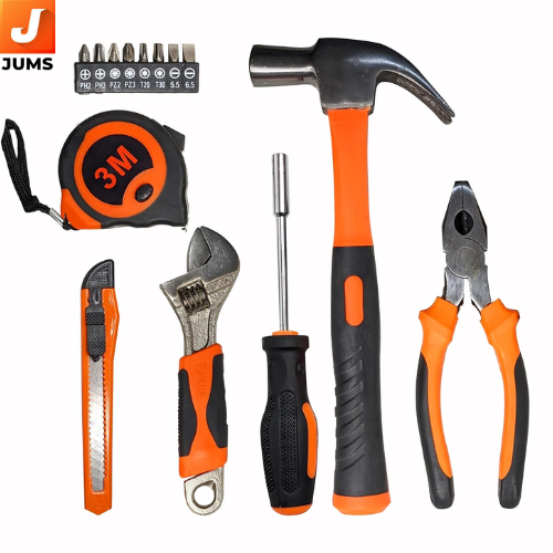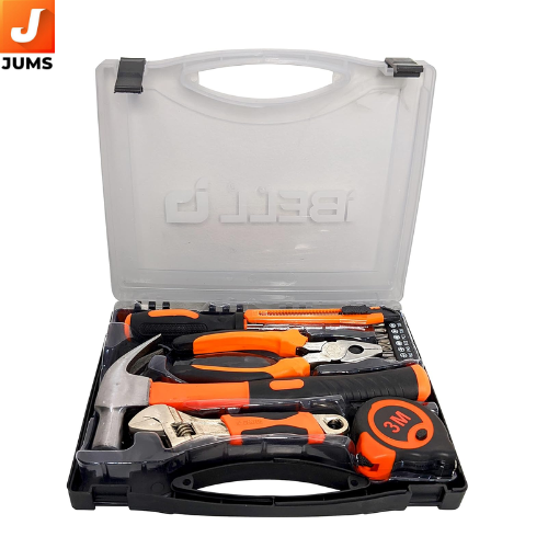 Essential 14-Piece Set: Includes core tools for everyday DIY and home repair tasks — perfect for quick fixes and general maintenance. Durable Steel Construction: Tools are made from sturdy, high-quality steel to withstand regular use and resist wear. Versatile Tool Selection: Screwdriver for driving and removing screws Claw Hammer for hammering and nail removal Plier for gripping and bending Wrench for bolts and nut tightening Utility Knife for cutting tasks Measuring Tape for quick measurements Bits for different screw types and sizes Hard Carry Case: Comes with a rugged and compact case that keeps all tools neatly organized, secure, and easy to transport. Ergonomic Design: Comfortable handles on tools provide better grip and control during extended use. Ideal for Home Use: Great for household repairs, furniture assembly, simple installations, and general workshop jobs.