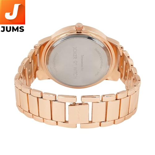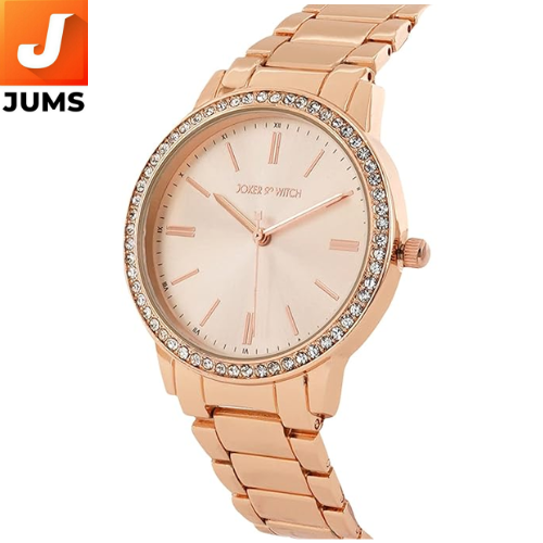 All‑Metallic Strap: Stylish metal alloy linked strap (often in rose gold, silver, or dual‑tone finishes) that gives a polished, jewelry‑like look. Rhinestone‑Studded Bezel: Shiny rhinestones around the dial case add sparkle and sophistication for dressier occasions. Sunray Dial: Round analogue dial with a refined sunray finish that enhances the overall elegance.Movement: Quartz movement ensures reliable and accurate everyday timekeeping. Display Type: Classic analogue display with simple hands and markers.Clasp Style: Standard deployment clasp for a secure and comfortable fit. Dial Size: Typically around a 38 mm diameter, balancing visibility with feminine styling.