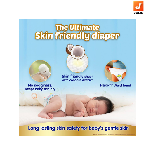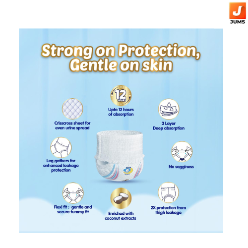 Our first Deep sleep diaper which helps in deep and better-quality sleep for babies. Deep Absorbent crisscross sheet: 3-layer deep absorption leaves no wetness on the topsheet, and no heaviness on bottom, so prevents leakage without sogginess for upto 12 hours.