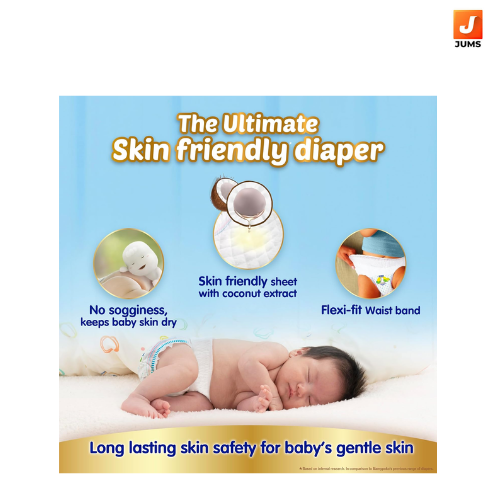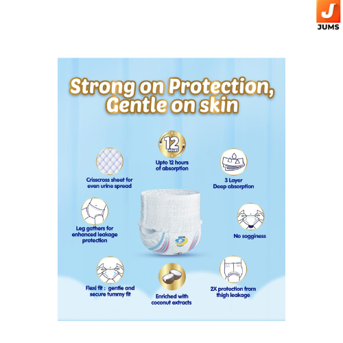 Our first Deep sleep diaper which helps in deep and better-quality sleep for babies. Deep Absorbent crisscross sheet: 3-layer deep absorption leaves no wetness on the topsheet, and no heaviness on bottom, so prevents leakage without sogginess for upto 12 hours