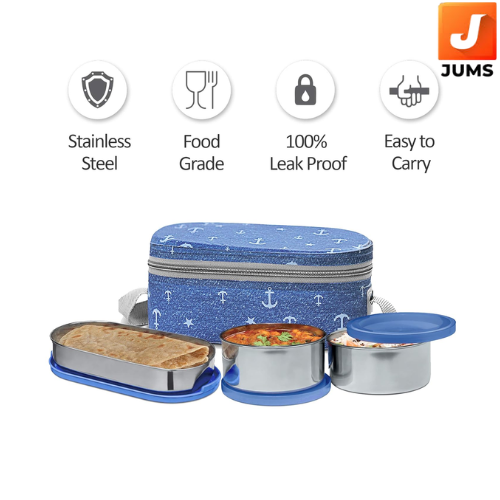 Material type: Stainless Steel; No. of containers: 3; Capacity of containers: 2 Pc Round container 280 ml each, 1 Pc Oval container 500 ml; Contents include: Corporate Lunch Box (3 Containers); Colour: Blue