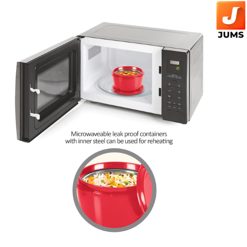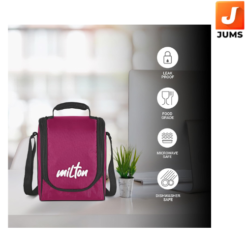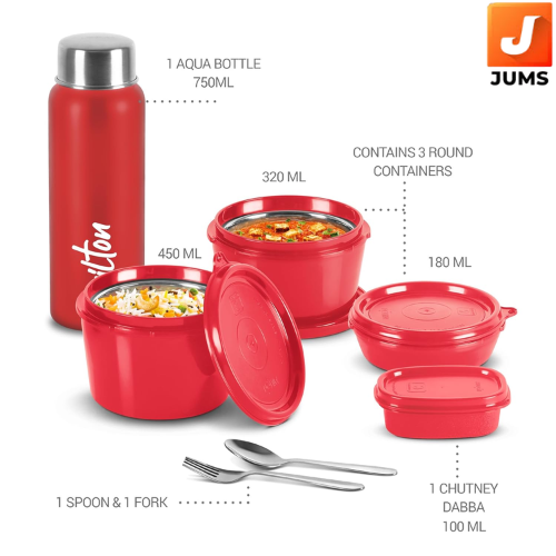 Color: Maroon; Material: Stainless Steel & Plastic; Package Content: 1 - Piece Pro Lunch Set (3 Microwave Safe Containers 180 ml, 320 ml, 450 ml; 1 Chutney Dabba, 100 ml; 1 Aqua Bottle, 750 ml, 1 Spoon, 1 Fork, 1 Jacket)