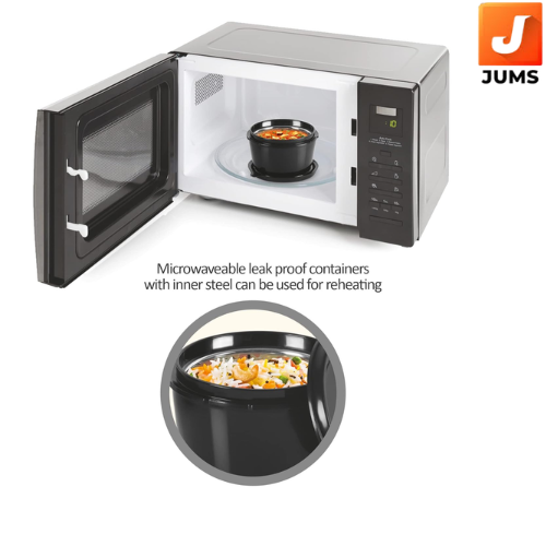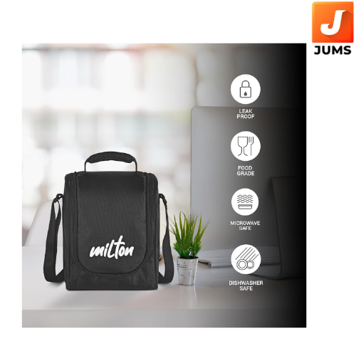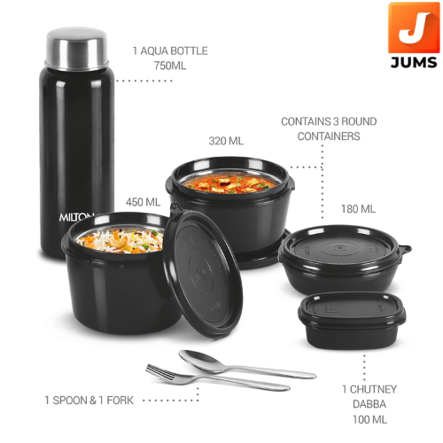 Color: Black; Material: Stainless Steel & Plastic; Package Content: 1 - Piece Pro Lunch Set (3 Microwave Safe Containers 180 ml, 320 ml, 450 ml; 1 Chutney Dabba, 100 ml; 1 Aqua Bottle, 750 ml, 1 Spoon, 1 Fork, 1 Jacket)