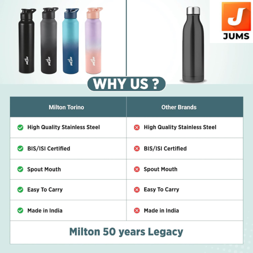 #1 WATER BOTTLES BRAND : Join the club, choose the premium brand and elevate your style with Milton. 50 YEARS OF INDIAN INNOVATION : Milton Water Bottle features a sleek, single-walled design for everyday convenience.