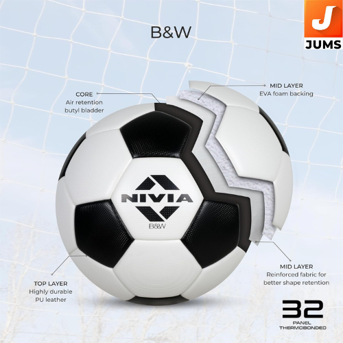 Brand: Nivia Model: B&W Football (Black & White) Type: Thermobond / Match & Training Ball Size: Size 5 (Standard adult size) Panel Construction: 32 panels for stable flight and shape retention