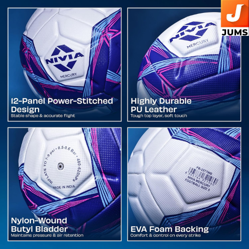 Brand: Nivia Model: Mercury Football Material: High-quality PU (Faux) Leather Colour: White / Blue Panel Design: 12-Panel construction Stitching: Power-stitched for enhanced durability Size: Size 5 (Standard match size) Item Weight: Approx. 450 grams Age Range: Youth & Adults Usage: Match play and regular practice Grip & Control: Textured surface for better ball control