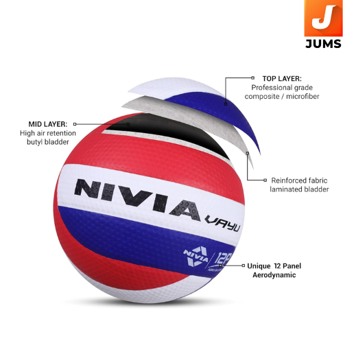 Brand: Nivia Product: Vayu Volleyball (Match ball) Size: Size 5 (standard official volleyball size) Panel Construction: 12 panels for balanced flight and stability during play.