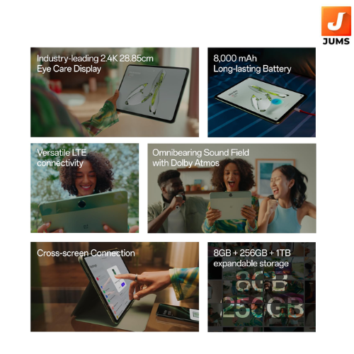 [Outstanding Display]: 2.4K 2408x1720 Ultra-High resolution, 11.35-inch/28.85cm Massive Display, 7:5 ReadFit screen ratio & 260 PPI with 400 nits brightness. [Awesome Audio]: OnePlus omnibearing sound with Dolby Atmos Quad Speakers [Eye Care]: Low Blue Light (TÜV Rheinland Certified) ; Intelligent brightness ; DC Dimming ; Bedtime Mode
