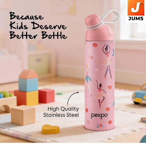 PEXPO Water Bottle for School Kids, ISI Certified Stainless Steel Sipper Bottle for Kids 470ml | Hot & Cold Thermos Insulated Water Bottle|6+ Years Kids|Pico 500 - Pink - Dancing Girl