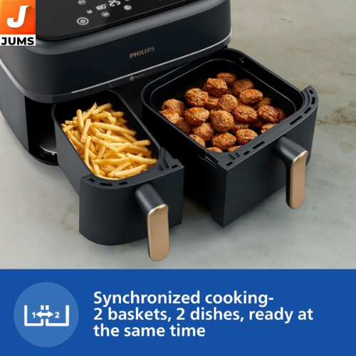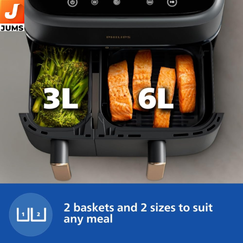 Large Capacity: 9 L total with two baskets (≈6 L + 3 L) — cook a full meal or two dishes at once. Dual Basket System: Independent baskets let you cook main and sides simultaneously. Extra-Large Tray Cooking: Can handle full oven tray-size meals. Rapid Air Technology: 360° hot-air circulation for crispy, evenly cooked food with less oil.
