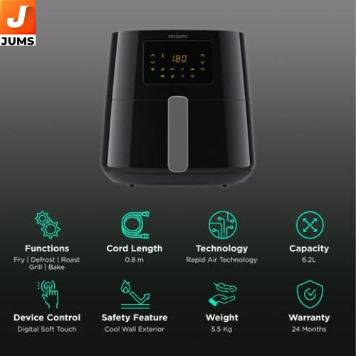 The Philips Airfryer XL HD9270/70 is a high-capacity digital air fryer designed for family-sized cooking with efficient and healthy results. Its 6.2 L basket can hold around 1.2 kg of food, making it ideal for preparing meals for 4–5 people in one go — perfect for family dinners, gatherings, and batch cooking.