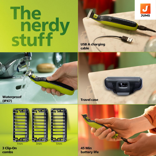 Hybrid 3-in-1 Grooming: Designed to trim, edge, and shave facial hair with one device — no need for separate trimmer and shaver. Dual Protection Technology: Features a glide coating with rounded tips, which helps protect the skin and reduce irritation while shaving or trimming. Fast Cutting Performance: Turbo-charged cutter capable of up to 12,000 cuts per minute for efficient grooming, even on longer hairs. 3 Stubble Comb Attachments: Includes 1 mm, 3 mm, and 5 mm combs for precise stubble trimming — from tight to long styles.