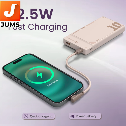 Battery Capacity: 10,000 mAh — enough to charge most smartphones ~1–2 times depending on battery size. Timti.in Fast Charging: Supports 22.5 W fast charging for quicker device top-ups via the built-in cable or USB-A port. Timti.in Built-in Detachable Type-C Cable: Convenient integrated Type-C to Type-C cable always on hand for charging compatible phones, tablets, earbuds, etc. The flexible cable can also double as a carry loop. Timti.in Dual Output: Use the built-in Type-C cable and the USB-A port simultaneously to charge two devices at once. Bidirectional Type-C (In/Out): The top Type-C PD port works for both charging the power bank and powering devices. Timti.in LED Battery Indicator: Shows remaining charge status so you know when to recharge. Timti.in Slim & Portable: Lightweight, compact design makes it easy to carry in a pocket or bag. Timti.in 12-Month Warranty: Includes standard manufacturer warranty for peace of mind