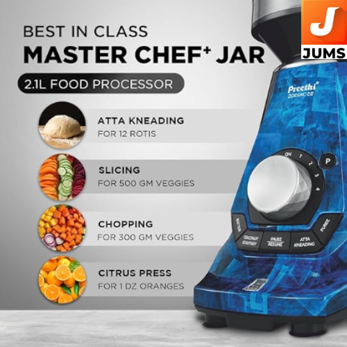 Powerful 1000 W motor – Strong high-power motor for tough grinding and heavy use. 4 versatile jars included – Comes with 2 stainless steel grinding jars, a Super Extractor juicer jar, and a Master Chef food processor jar for multi-purpose kitchen tasks. Preset precision grinding – Offers precision grinding menus that help enhance nutrient bio-availability and consistent texture for chutneys, batter, puree, and more. Master Chef food processor jar – Handles dough kneading, chopping, grating, slicing, and meat mincing efficiently.