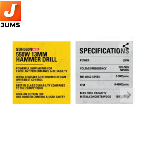 The Stanley SDH550N-IN 550 W 13 mm Impact Drill is a corded electric hammer/impact drill designed for versatile drilling tasks in wood, metal, and masonry. It features a 550 W motor that delivers strong power for everyday drilling and light hammer action, with a no-load speed up to ~3000 rpm and an impact rate up to ~48,000 bpm for efficient penetration of tough materials like concrete and brick.