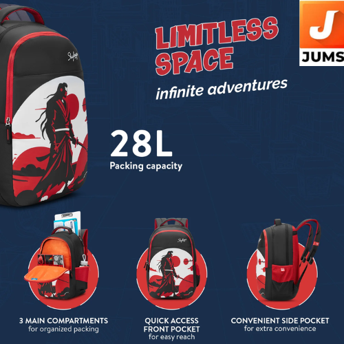 Brand: Skybags Model: Kyro Anime Capacity: 28 liters Color: Samurai Black (sleek and modern design) Material: Soft feel fabric polyester for a comfortable and durable feel Compartments: 3 compartments for organized storage Side Bottle Pocket: 1 side pocket to carry a water bottle or small accessories Shoulder Straps: Built to last with padded and ergonomic design for comfort Ideal for: School, college, casual outings, light travel Design: Anime-inspired, trendy design suitable for boys and girls Durability: Made with high-quality stitching and materials for long-term use Weight: Lightweight, easy to carry for daily use