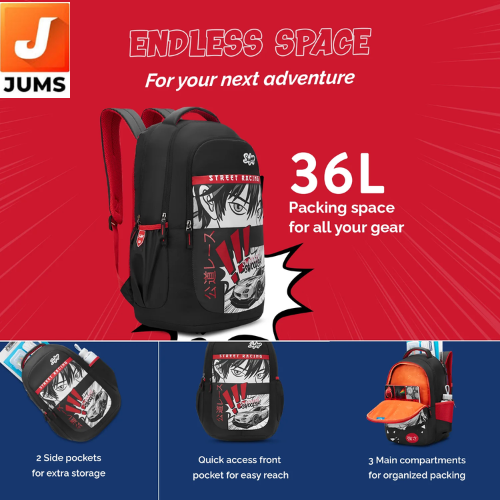 Brand: Skybags Model: Kyro RC Anime Capacity: 36 liters Color: Swoosh Black (stylish, sleek black with modern design elements) Material: Durable polyester fabric for long-lasting performance Compartments: 3 spacious compartments for organized storage Side Pockets: 2 side bottle pockets for easy access to drinks Raincover: Includes a rain cover to protect your items from rain Shoulder Straps: Built-to-last, ergonomic, and padded for enhanced comfort Ideal for: School, college, travel, outdoor activities, and casual use Design: Anime-inspired design, appealing to both boys and girls Durability: Sturdy construction with reliable stitching for long-term use Weight: Lightweight, making it easy to carry for extended periods
