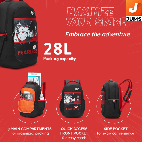 Brand: Skybags Model: Kyro RC Anime Capacity: 36 liters Color: Rebel Black (stylish, bold black with edgy design elements) Material: Durable polyester fabric Compartments: 3 spacious compartments for organized storage Side Pockets: 2 side bottle pockets for convenient hydration access Raincover: Included rain cover to protect belongings from rain Straps: Built-to-last, ergonomic, padded shoulder straps for comfort Ideal for: School, college, travel, sports, and casual use Design: Anime-inspired design, appealing to boys and girls Durability: Robust construction with strong stitching for long-term use Weight: Lightweight, making it easy to carry Additional Features: Trendy, youthful design with extra functional elements