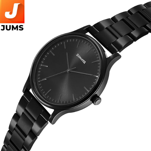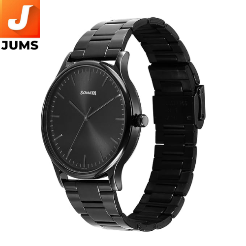 Sonata Aspire Quartz Analog Black Dial Stainless Steel Strap Watch for Men is a stylish and practical everyday analog wristwatch designed for men who want a classic look with modern reliability. It features a black dial with a traditional three‑hand analog display powered by a quartz movement, offering consistent and low‑maintenance timekeeping. The black stainless‑steel strap and round metal case give the watch a sleek, contemporary appearance that pairs well with both casual and semi‑formal outfits, while mineral glass protects the dial from everyday scratches.