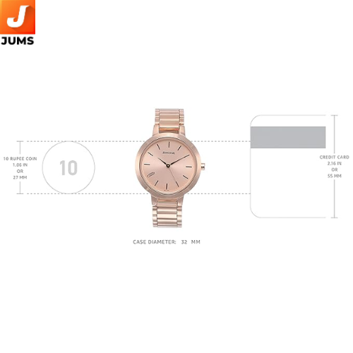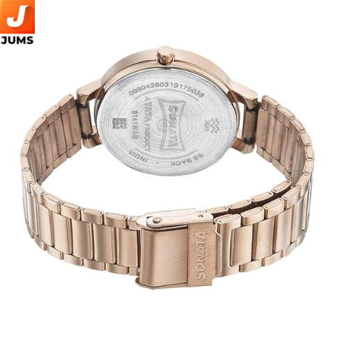 This women’s analog watch from Sonata’s Play collection features a chic rose‑gold dial paired with a rose‑gold stainless‑steel strap, giving it a stylish and feminine look suitable for everyday wear and casual occasions. It uses a quartz movement for accurate timekeeping and has a round metal case protected by mineral glass.
