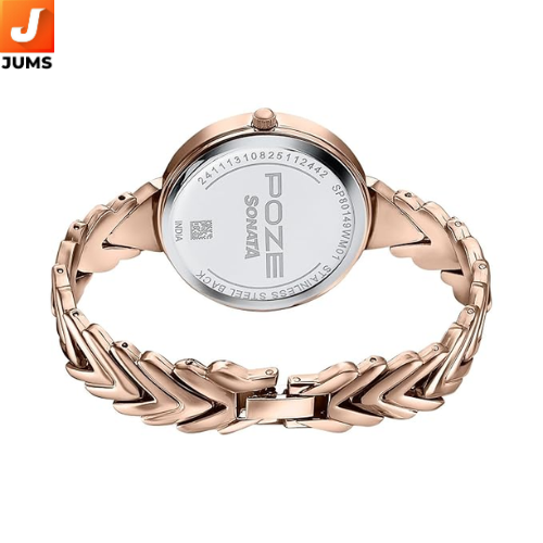This watch features a white Mother of Pearl (MOP) dial that gives a subtle shimmer and elegant look, paired with a rose‑gold‑tone alloy strap for a fashionable finish that works well with both casual and dressy outfits. It uses a quartz movement for dependable timekeeping and has a round analog display with a clean, easy‑to‑read face.