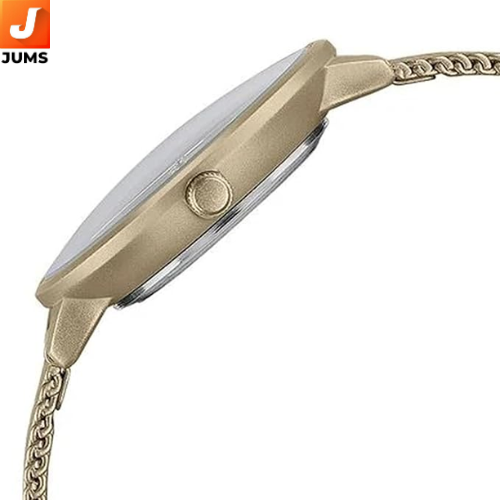 Quartz movement for reliable and accurate timekeeping — low maintenance and everyday ready. Analog display with classic hour and minute hands in a simple, readable layout.Golden dial offering a feminine, stylish look that pairs well with both casual and semi‑formal outfits. Round case shape — timeless and versatile. Mineral glass protects the dial from daily wear and minor scratches.Case material: Alloy — lightweight yet sturdy for comfortable all‑day wear. Strap: Elegant golden mesh strap, adding a polished and contemporary touch. Lock mechanism: Sliding clasp for a secure and adjustable fit.