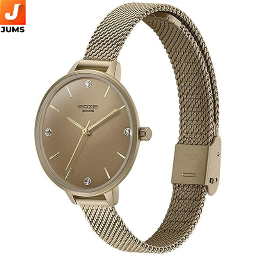 This women’s analog watch from Sonata’s Poze collection combines a golden round dial with a matching golden mesh strap for a chic and versatile look that works well with both casual and semi‑dressy outfits. The timepiece runs on a quartz movement, ensuring dependable and accurate timekeeping, and features mineral glass to protect the dial. Its round alloy case offers a classic silhouette, while the sliding clasp on the mesh strap provides a secure and adjustable fit.