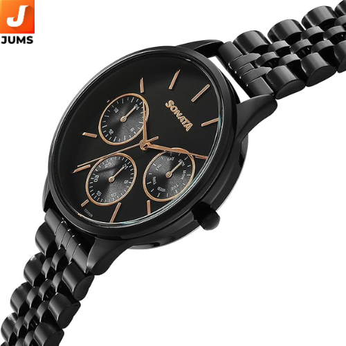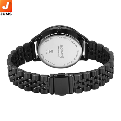 This women’s analog watch from Sonata features a black dial paired with a stainless steel strap, creating a sleek and timeless design that works well for both everyday and casual wear. It uses a quartz movement for reliable and accurate timekeeping and has a round, metal case protected by mineral glass. The stainless steel bracelet enhances durability and gives a polished look. Practical and stylish, this watch also typically includes a 12-month warranty on movement and battery for peace of mind.