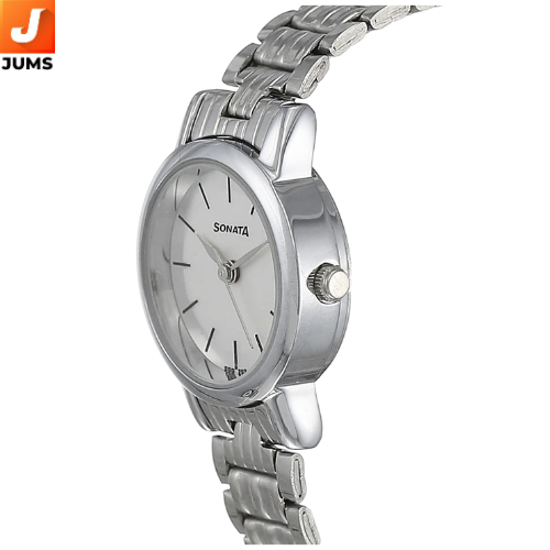 This Sonata women’s watch features a clean white analog dial paired with a silver-coloured stainless steel strap, giving it a classic and versatile look suitable for everyday and casual wear. It runs on a quartz movement for accurate timekeeping and has mineral glass protecting the dial. The watch is secured with a three-piece sliding clasp and has a metal case in a compact shape that complements smaller wrists.