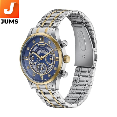 The Sonata Wedding Edit Quartz Multifunction Blue Dial Stainless Steel Strap Watch for Men is a elegant and versatile analog wristwatch that blends traditional design with everyday functionality. It features a striking blue round dial with multiple sub‑dials for added convenience and a quartz multifunction movement that ensures dependable timekeeping. The watch comes with a stainless steel strap and a sturdy metal case, giving it a polished look that pairs well with both casual and semi‑formal outfits.