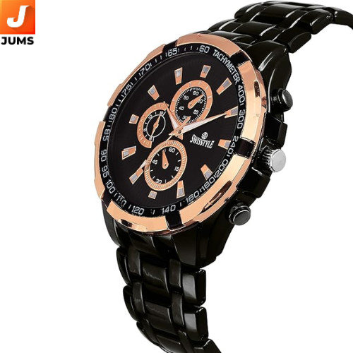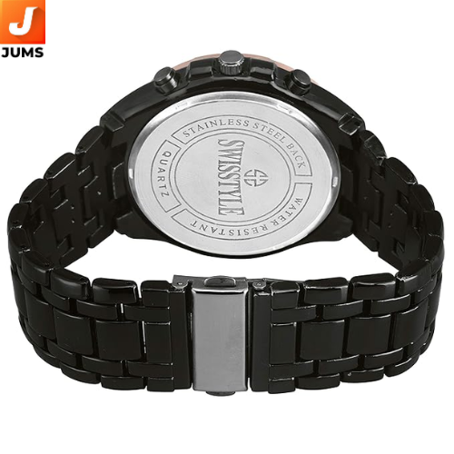 Brand: SWISSTYLE Model: Black Chain Chrono Look Analog Watch Dial Color: Black Dial Shape: Round Case Material: Stainless Steel Strap Type: Stainless Steel Chain (Black) Movement Type: Quartz Water Resistance: 30 meters (3 ATM) Display Type: Analog (Chronograph Look) Glass Type: Mineral Glass Gender: Men’s Case Diameter: Approx. 44mm Case Thickness: Approx. 12mm Strap Width: Approx. 22mm Warranty: 1-year manufacturer warranty