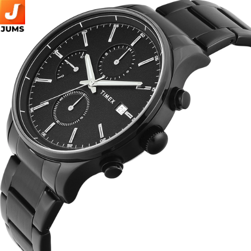 Round Black Dial: Offers a sharp, modern aesthetic that’s easy to read and visually versatile. Analog Display: Traditional three‑hand analog format (hour, minute, second) for classic readability. Dial Markers & Hands: Often clear markers and hands that stand out against the dark background for good legibility.Case Material: Stainless steel or brass (varies by exact model), offering durability and a refined look. Strap: Typically stainless steel bracelet or comfortable band depending on model. Mineral Glass: Scratch‑resistant crystal protects the dial against everyday wear.Quartz Movement: Battery‑powered quartz movement ensures accurate and dependable timekeeping — a hallmark of Timex watches. Water Resistance: Usually around 30 – 50 m (splash‑proof to light water exposure), suitable for daily use.