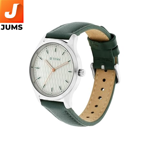 Brand: Titan Collection: Ladies Neo Economy Display Type: Analog Dial Color: White with a subtle dual‑pattern texture Strap: Genuine leather (often shown with green strap in popular listings) Movement: Quartz movement for accurate timekeeping Case Material: Metallic case with stainless steel back Water Resistance: Typically around 30 m (splash‑resistant) Dial Size: ~33 mm (medium, comfortable for most women) Clasp: Tang buckle (common on leather strap) Style: Elegant, classic, suitable for casual and formal wear Occasion: Ideal for everyday use, office wear, gifting & occasions