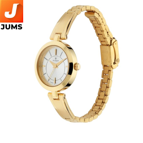Brand: Titan Type: Quartz Analog Watch Gender: Women Dial: White, clean and simple design with minimal hour markers Strap: Gold metal (stainless steel) strap for an elegant finish Movement: Quartz movement for accurate timekeeping Water Resistance: Typically 30 meters (splash-resistant) Case Material: Stainless steel for durability and comfort Dial Size: Medium-sized, suitable for various wrist sizes Design: Elegant, timeless, and versatile for various occasions Style: Sophisticated and chic, perfect for formal and semi-formal wear Occasion: Ideal for office wear, formal events, or gifting Affordability: Mid-range, offering luxury and functionality