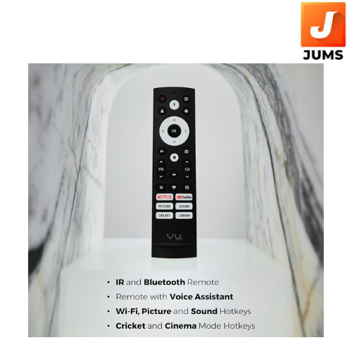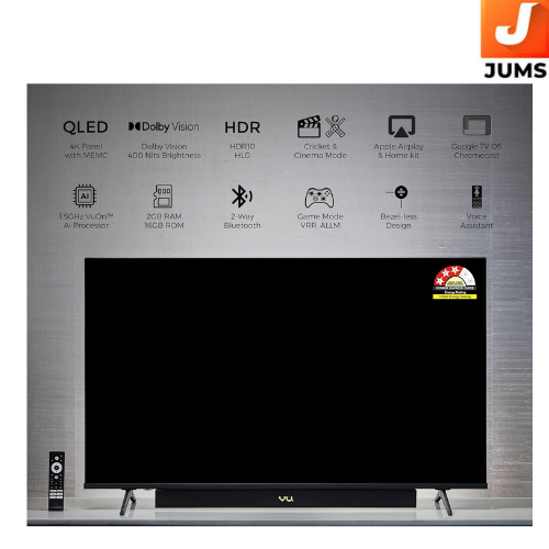 | Special Feature | 4K QLED | A+ Grade Panel | 400 Nits Peaking Brightness | Dolby Vision, HDR10 & HLG | Motion Enhacement with MEMC I FILMMAKER Mode | Cricket Mode | Cinema Mode | AI Smart Scene & Upscale | 88-Watt Integrated Soundbar | Dolby Atmos | Auto Volume Control | HDMI 2.1 | 1.5GHz VuOn™ Processor | 2 GB RAM & 16GB Storage | VRR | ALLM | HDR Gaming | Game Mode | Game Dashboard I ActiVoice Remote Control | Apple Airplay | 2-way 5.3 Bluetooth | 5GHz Dual Band Wi-FI | Camera connectivity |