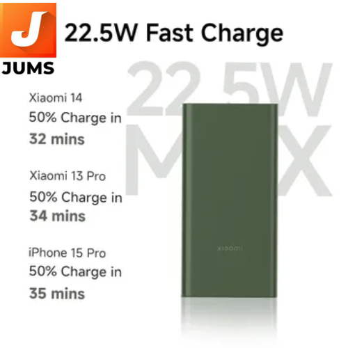 The Xiaomi Power Bank 4i 10000mAh in Green is a compact and powerful portable charger designed to keep your devices charged wherever you go. It supports 22.5W fast charging with Power Delivery (PD) and Quick Charge 3.0, offers multiple output ports, and features smart safety protection — all wrapped up in a durable aluminum‑alloy body