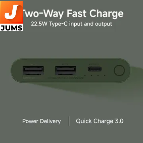 Fast Charging Savvy Supports up to 22.5 W fast charging on compatible devices via the USB‑C port. The USB‑C port handles both input and output (two‑way fast charging), meaning the power bank itself and your devices recharge quickly Fast Charging Savvy Supports up to 22.5 W fast charging on compatible devices via the USB‑C port. The USB‑C port handles both input and output (two‑way fast charging), meaning the power bank itself and your devices recharge quicklyFast Charging Savvy Supports up to 22.5 W fast charging on compatible devices via the USB‑C port. The USB‑C port handles both input and output (two‑way fast charging), meaning the power bank itself and your devices recharge quicklyFast Charging Savvy Supports up to 22.5 W fast charging on compatible devices via the USB‑C port. The USB‑C port handles both input and output (two‑way fast charging), meaning the power bank itself and your devices recharge quickly Triple Output Ports 1 × USB‑C port and 2 × USB‑A ports let you charge up to three devices at once, like phones, tablets, earbuds, or smartwatches